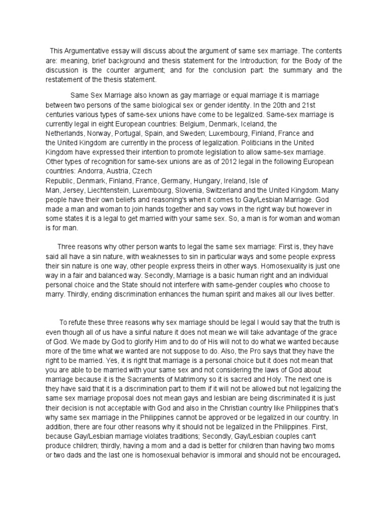 Same sex marriage also allows two people in love to become one in a matrimonial union and live happily together. Denying homosexual couples the right to marry is thus denying them the right gay marriage essay arguments be in love just like heterosexuals do.